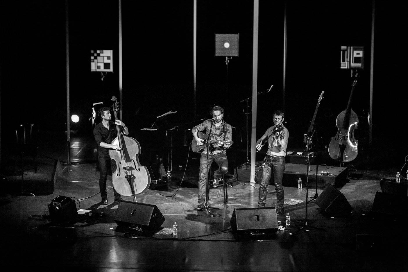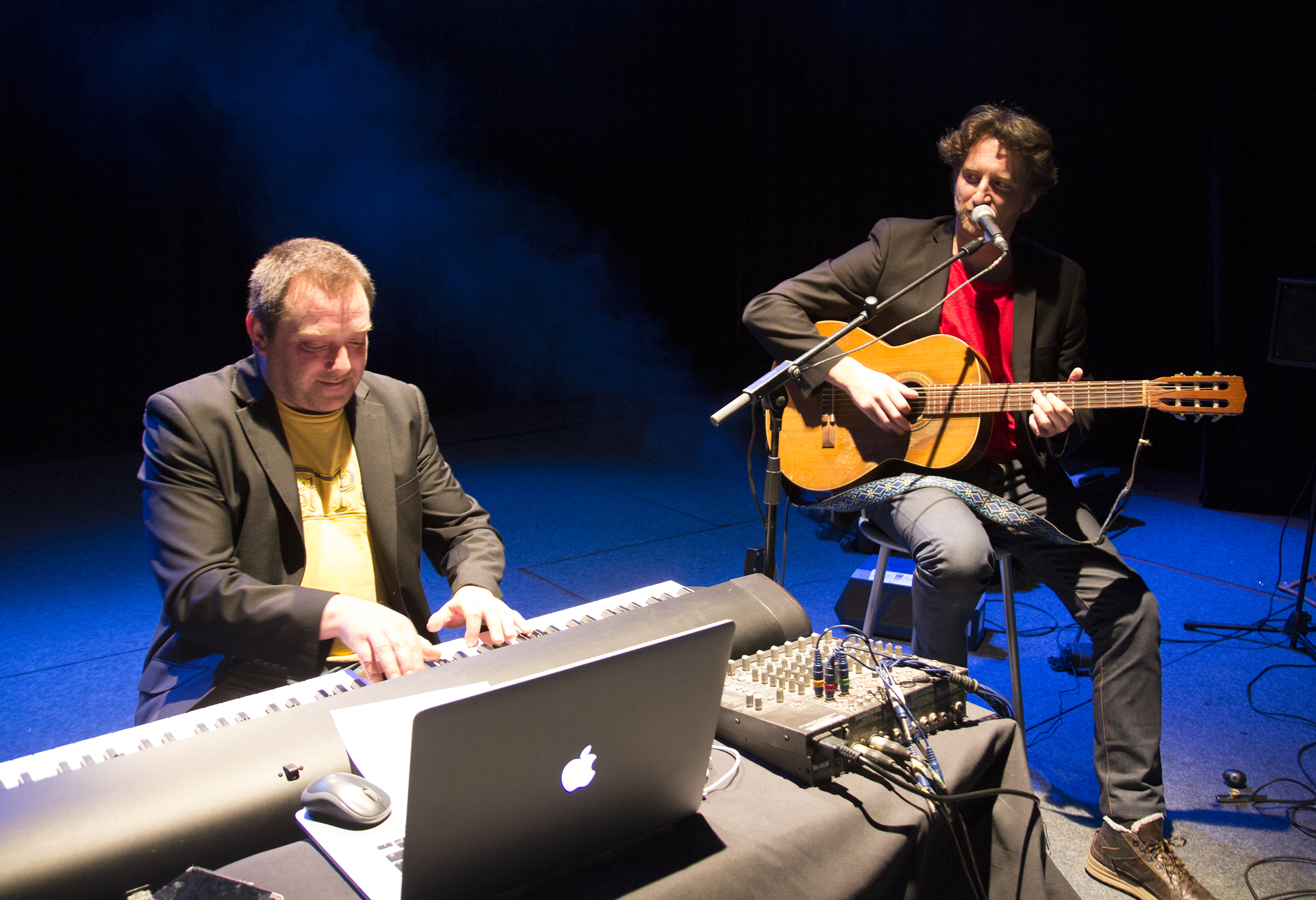 D’abord, il y a les outils, car un bon ouvrier doit avoir de bons outils : une gratte, un clavier, des micros, des samples en LIVE, du son quoi ! Mais il y aussi des hommes, 2 pour dire vrai, qui travaillent à la chaine, ou plutôt à la boucle, avec la Loop Station, (à ne pas confondre avec le jouet virtuel au nom quasi similaire). Biensûr il y a Alex, qui bricole ses textes pour nous faire marrer et ses choeurs pour nous faire planer.